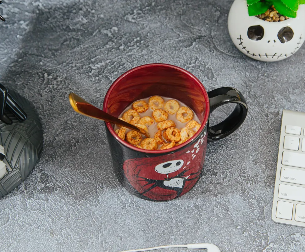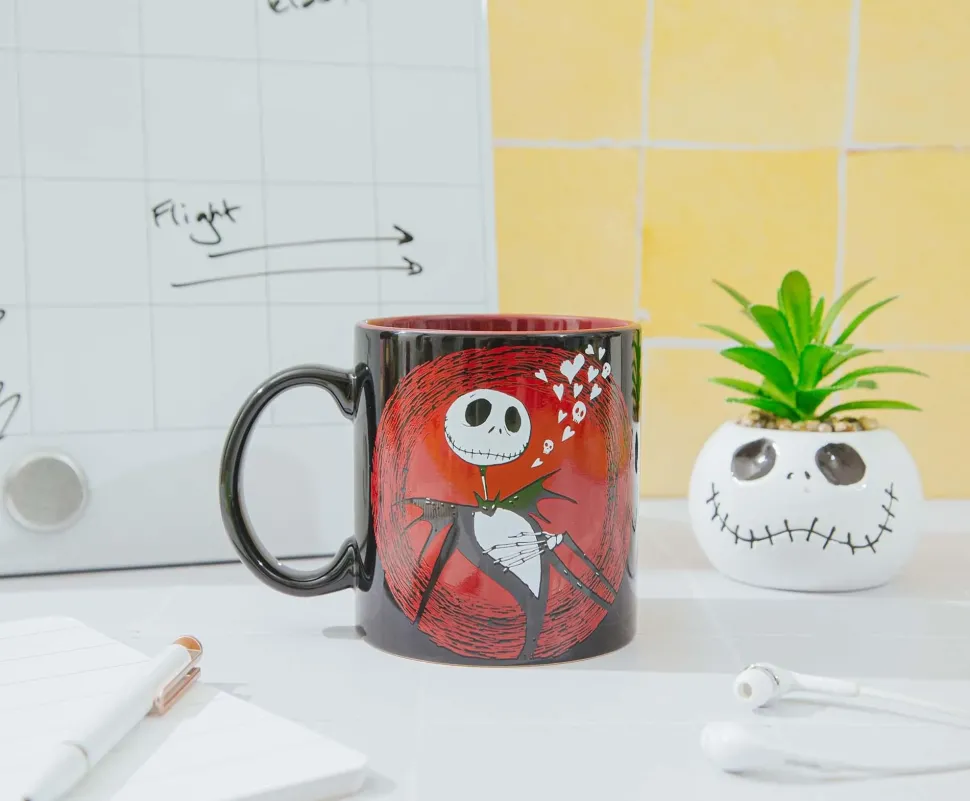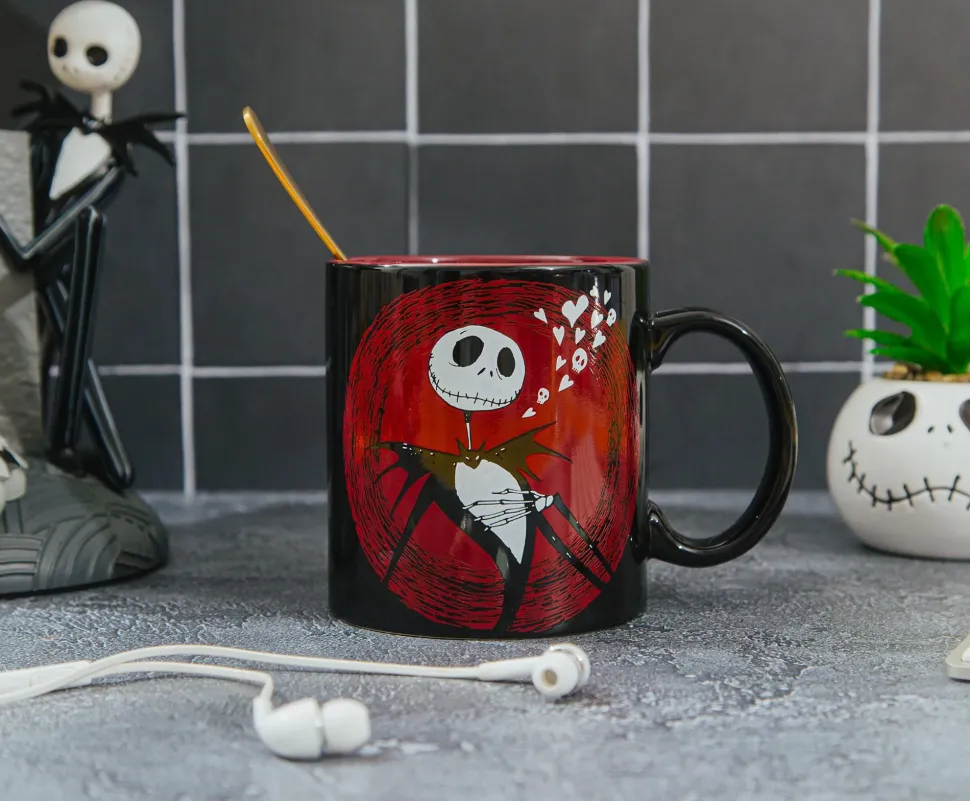 It’s all treats and no tricks with this creepy cup featuring the king of Halloween Town, Jack Skellington. With its eerie red and black design, this mug depicts a happy Jack with hearts and grinning skulls. Bring some Halloween spirit to your next beverage with some inspiration from the Pumpkin King himself.