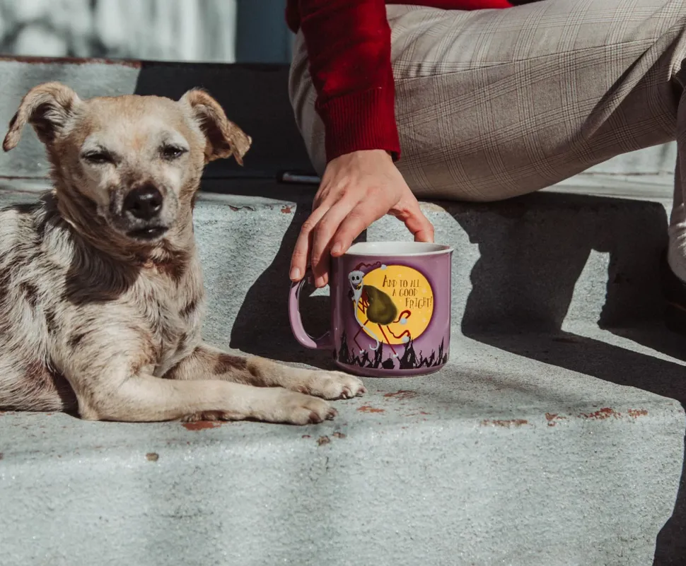 Your favorite spooky inhabitant from Halloween Town has taken on the guise of Santa Claus, or should we say Sandy Claws? On this peculiar purple mug, you’ll find dear old Jack striding over the rooftops, his sack filled with all kinds of gifts, sure to confuse and terrify all the good little girls and boys. And over a bright yellow moon, you’ll see him shouting out “And To All A Good Fright!”