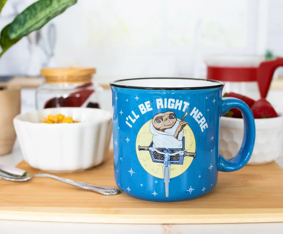 One side features E.T. tucked in a bike basket and using his telekinesis to soar across a moonlit sky. The heartwarming line “I’ll Be Right Here” curves around the top of the graphic. The opposite side features a silhouette of Elliot and his friends flying on their bicycles to evade authorities. The speckled camper mug features starry elements with a glossy blue finish and a black rim.