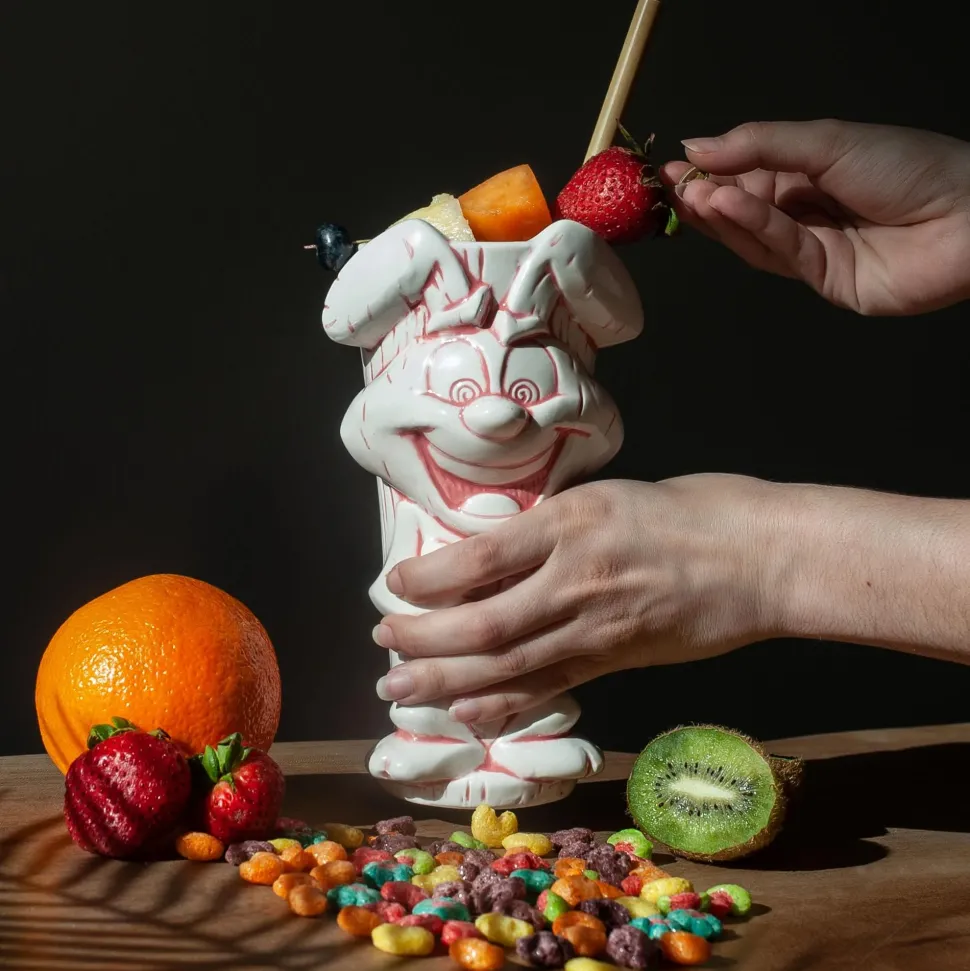 Inspired by the popular General Mills cereal mascot, this whimsical drinkware gives Trix Rabbit a tropical upgrade. Disinterested in plain old carrots, he has his eyes set on fruity-flavored delights. The high-end sculpted detailing of this ceramic mug features Trix Rabbit with a pair of swirly, wingding eyes and a spiral gaze. On the reverse side, the slogan “Trix are for kids” is etched into the design.