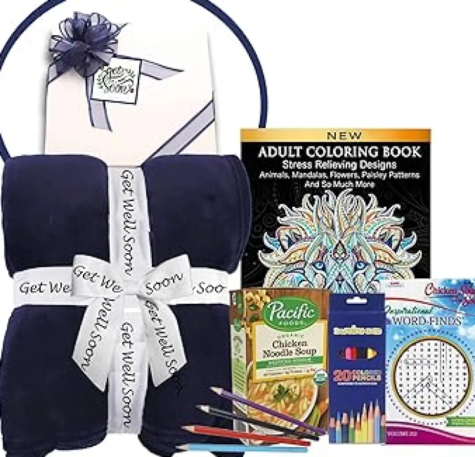 This get well soon basket – get well gifts for women includes: 50×60 soft blanket wrapped in a get well ribbon, Chicken noodle home style soup, Chicken Noodle soup for the soul inspirational word finds, Exotic Animals & Mandalas adult coloring book with over 75 pages of de-stressing beautiful pages to color, artists colored pencils in a 12 pc set, our custom Get well soon gift box with ribbon.