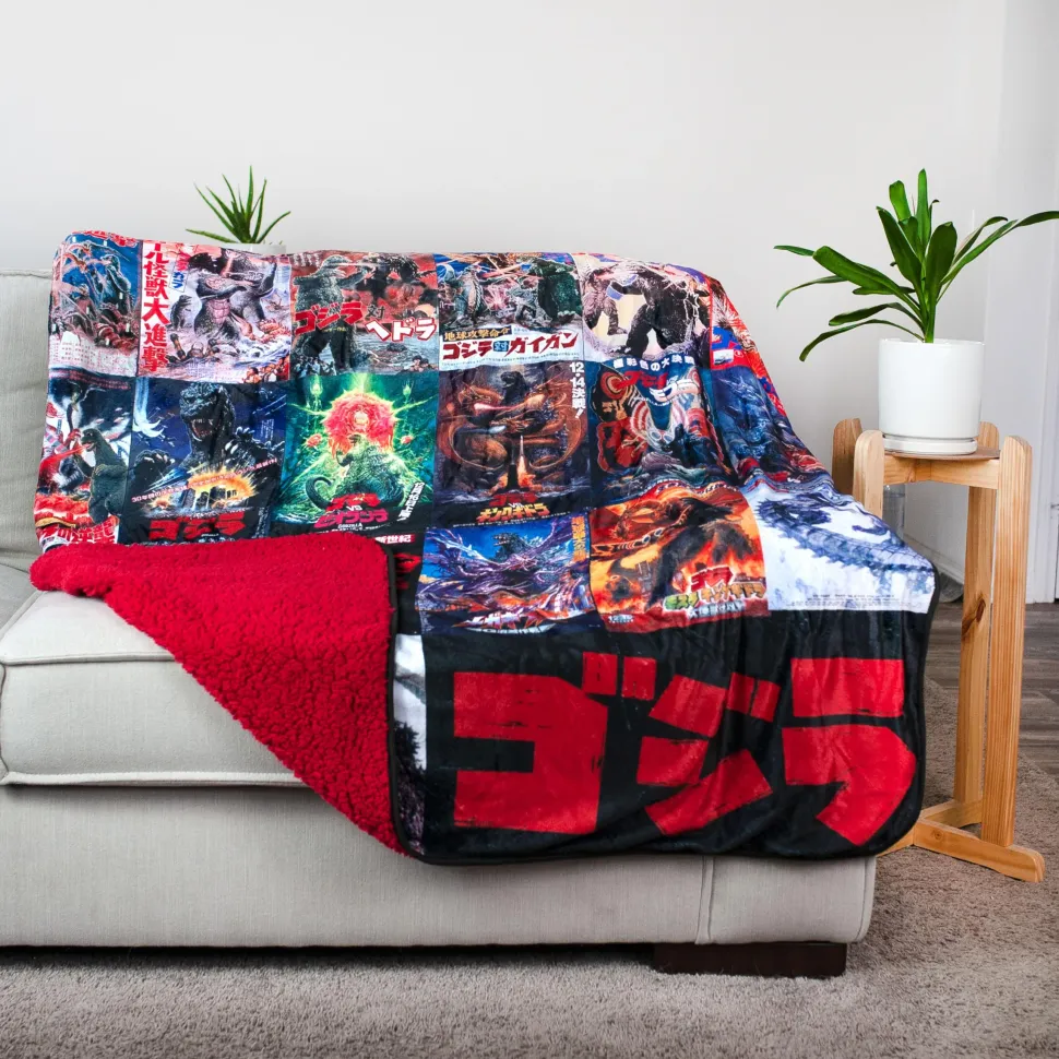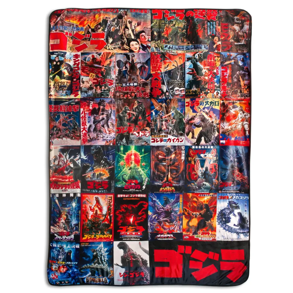 This cozy throw blanket features 30 different classic and new-age Godzilla movie posters including: