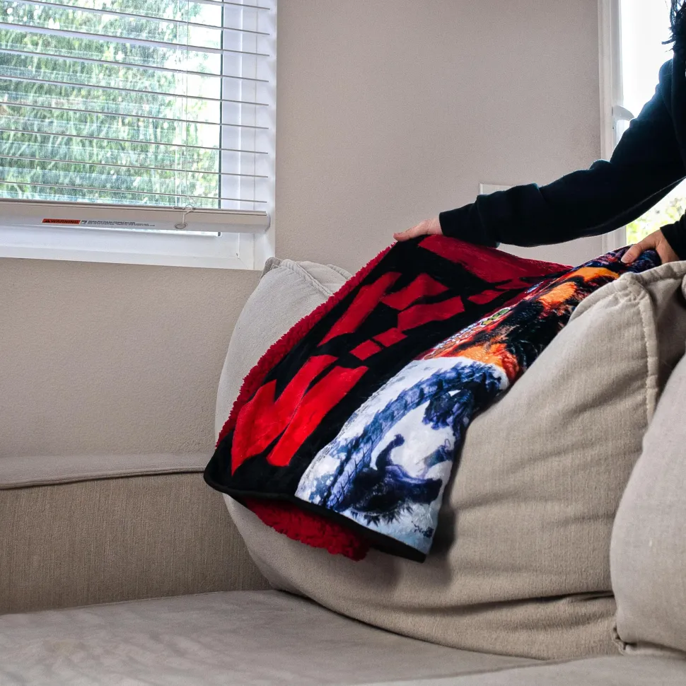 Soft to the touch, this fleece blanket is crafted with high-quality polyester material. You can wrap yourself up comfortably in this oversized throw blanket, measuring approximately 76 x 54 inches. It is also easy to clean and maintain — no matter how many epic kaiju battles it goes through.