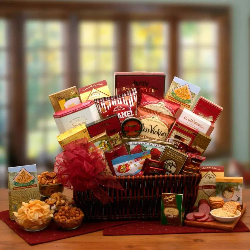 The Gourmet Ambassador Gourmet Gift Basket includes: Sourdough flatbread cheese crisps, Sonoma cheese straws, Three pepper water crackers, crunchy caramel corn, Tavolare snack mix, cranberry harvest fruit and nut trail mix, smoked almonds, cherry bon bon candies, Chambery French truffles, Jelly Belly 20 most popular flavors bag of Jelly Beans, Rail Dried strawberry fruit, Ghirardelli classic milk chocolate squares, Miss Vickie’s kettle cooked chips, Kettle cooked fudge, Truffle chocolate covered shortbread cookies, Old Dominion peanut brittle, Walkers chocolate chip shortbread cookies, Walker’s butter shortbread cookies, assorted sugar shortbread cookies, Napa Valley sourdough nuggets pretzels, Jazzy double cheddar popcorn, Hawaiian Host chocolate covered Macadamia nuts, Almond Roca toffee, creamy dill cheese spread, 3 oz. Bavarian summer sausage, classic dark stain willow tray. This gift measures 16″ long by 12″ wide and 13″ tall weighs 8 pounds, is wrapped in cellophane and topped with a handmade bow.