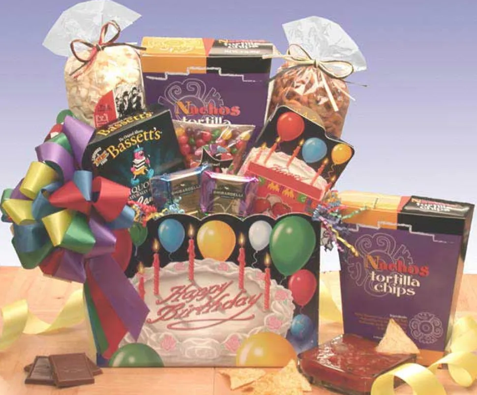 Includes: 2 oz. White Cheddar Popcorn, 4 oz. Pretzel sticks, 2 oz. Nacho Tortilla Chips, Petit Fruit Licorice, Celebrate Birthday Jelly Beans, Nacho Cheese Dip, Honey Sweet peanuts in a Birthday Box, Assorted Ghirardelli Chocolates 8 Squares and “Happy Birthday” Gift Box.