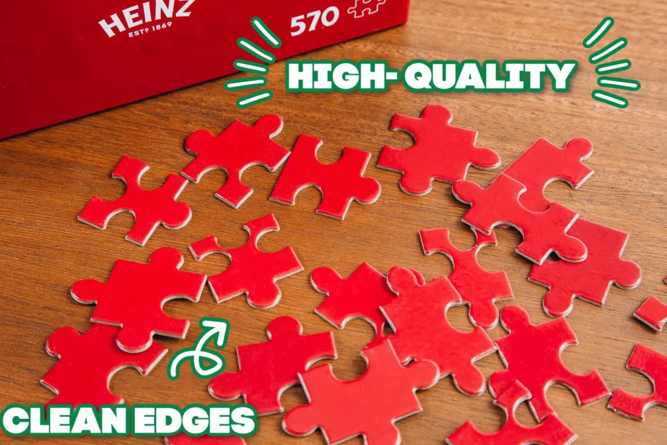 The eye-catching design is inspired by “the slowest ketchup in the west,” featuring an all-red pattern that matches the rich coloring of a juicy red tomato. The brilliant red design will give your space a pop of color, featuring vibrant styling that is sure to please any foodie. To top it off, the jigsaw pieces feature a beautiful glossy finish, giving the assembled puzzle a similar sheen to a Heinz Ketchup bottle.
