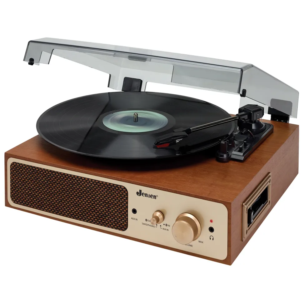 Listen to new and classic vinyl or cassettes with the JENSEN® JTA-245 Stereo Bluetooth 3-Speed turntable with cassette player and built-in speakers! This turntable offers several features you won’t find anywhere else for this value. The unit features Bluetooth transmit and receive, so you have the ability to wirelessly stream your records and tapes to Bluetooth enabled speakers and music systems, or stream music from your phone or Bluetooth enabled digital audio player to the turntable’s built-in stereo speakers.