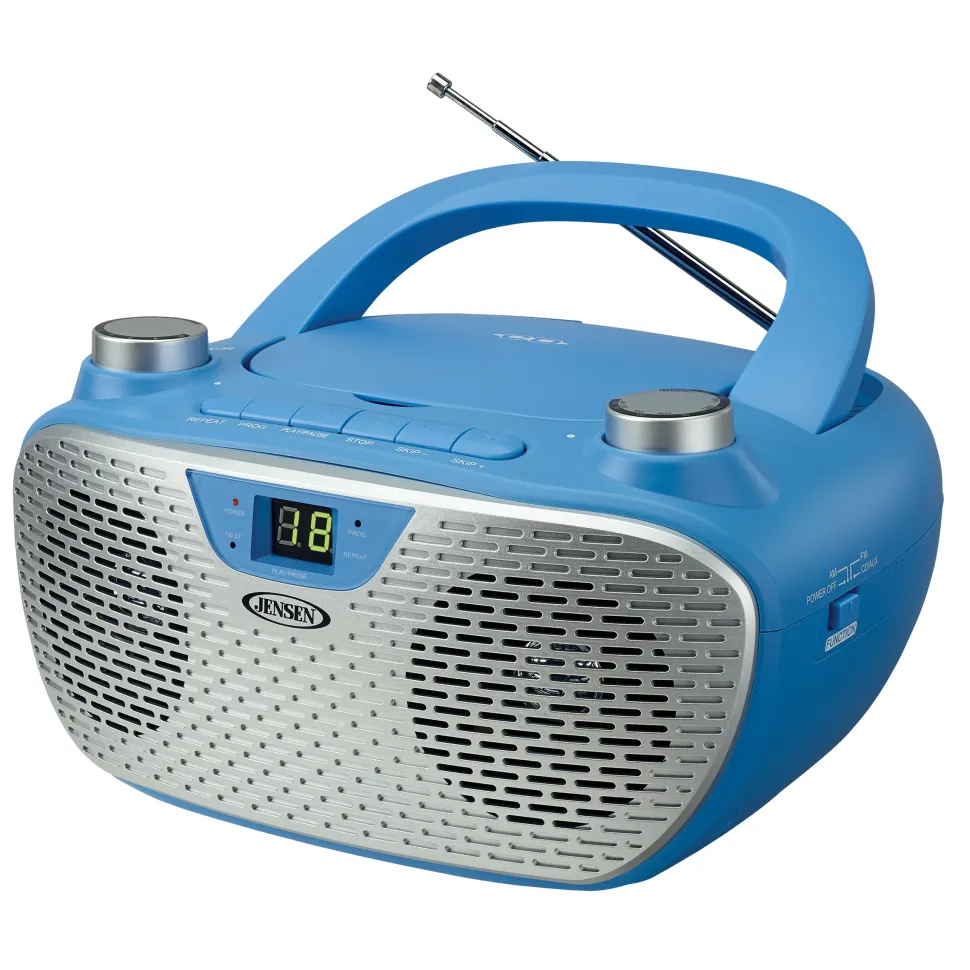 Experience great sound and portable convenience with the JENSEN® CD-485 CD player with AM/FM stereo receiver. This stylish portable player comes in 4 colors and has a carrying handle, so it’s ready to go with you wherever you go. Play music from a CD, AM/FM radio, or connect a digital audio player to the auxiliary input jack and play it right through the CD-485 speakers. This modern boombox also has a bright and bold green LED display that shows what CD track is playing. The stereo headphone jack allows you listen to music in private without bothering others around you. This device runs on 120V AC/60Hz as well as 6 x C batteries (not included).