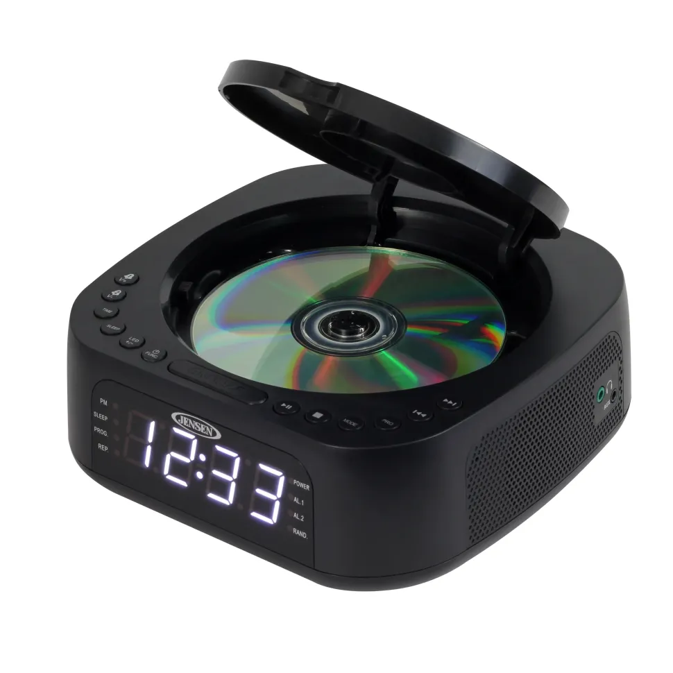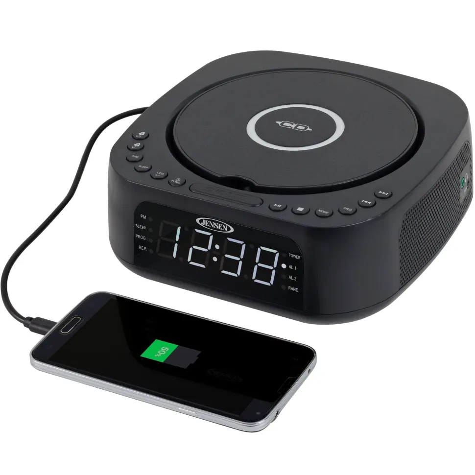 The JENSEN® JCR-375 Stereo Digital Dual Alarm Clock Radio with CD Player is the perfect all-in-one device for your nightstand or anywhere in the house. The top-loading CD player provides versatile playback options, and plays both store bought or custom recorded CD-R/CD-RW discs, including those with MP3 music files. The unit also features a digital FM radio that can store up to 20 FM presets for easy access, a bright and easy to read white LED display, an auxiliary input for connecting a digital audio player and a headphone jack for private listening. The dual alarm clock radio includes sleep and snooze functions and has the ability to wake you to radio, CD, or alarm. Also included is a 2.1A USB port for charging your smartphone. The unit operates on 120V AC power and includes a battery back-up for the clock settings.
