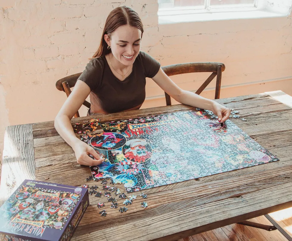 Treat yourself to a bit of the weird side of film with this unusual jigsaw puzzle. You’ll assemble the pieces to uncover a memorable collage of images from the classic alien invasion film. The crisp design is printed from high-resolution images using colorful inks that help stir your nostaligia. Each piece reveals another movie moments, with a fun Klown themed border adding another level of complexity to this puzzling challenge.
