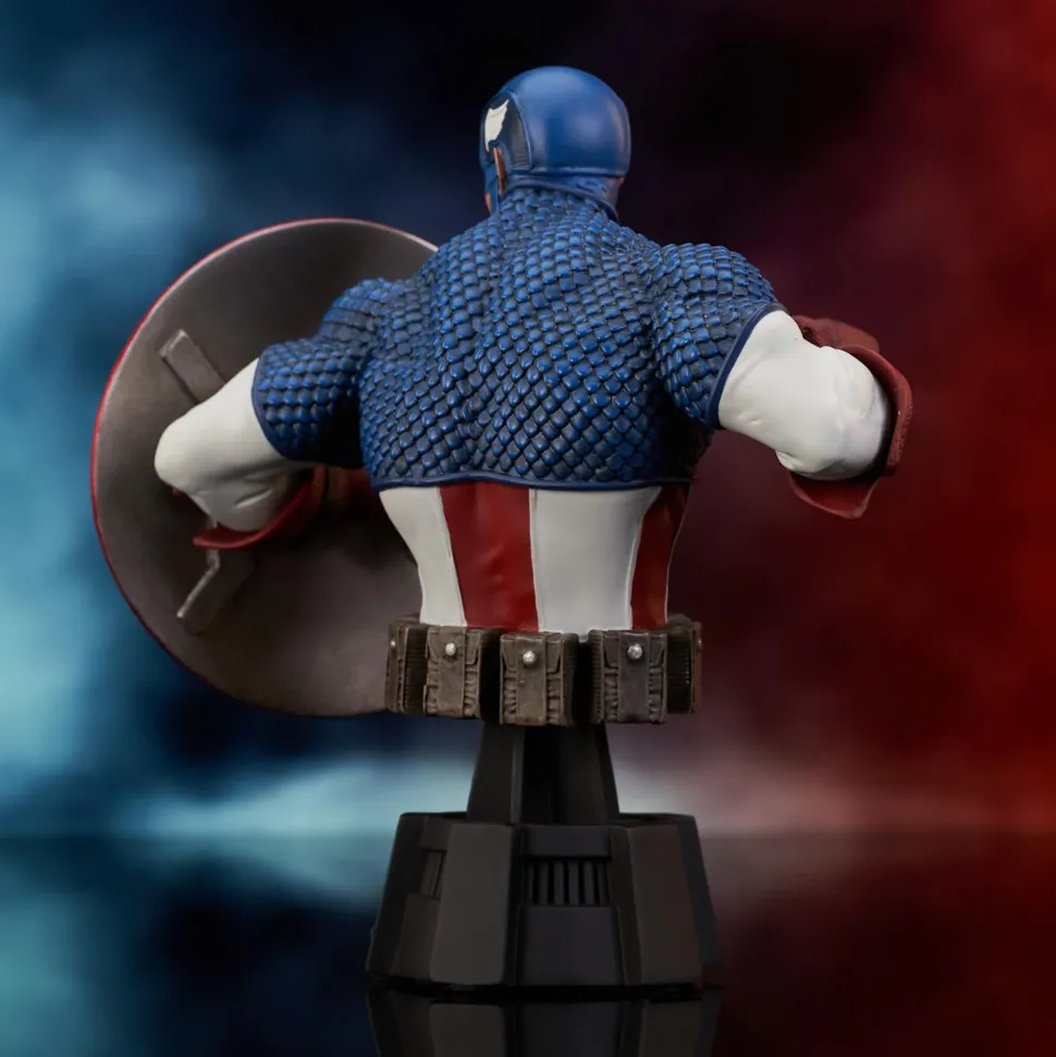 A Diamond Select Toys release Yield to the shield Captain America bursts onto the scene like a Fourth of July firework, joining the all-new series of 1/7 scale Marvel Comics busts Measuring approximately 6 inches tall, Cap holds his shield at the ready atop a pedestal base. Limited to only 3,000 pieces, it comes packaged in a full-color box with a numbered certificate of authenticity. Designed by Nelson Asencio, and sculpted by Juan Pitluk