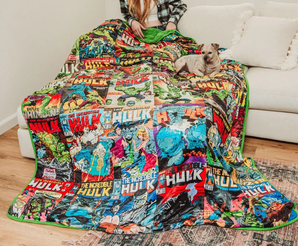 Calm your rage by snuggling up in this exclusive Marvel Hulk Comic Book Throw Blanket. Ever since the towering, muscle-bound hero debuted in 1962, the Hulk has become one of the most recognizable superheroes the world has ever known. This oversized fleece blanket pays tribute to his long and decorated history in Marvel Comics.