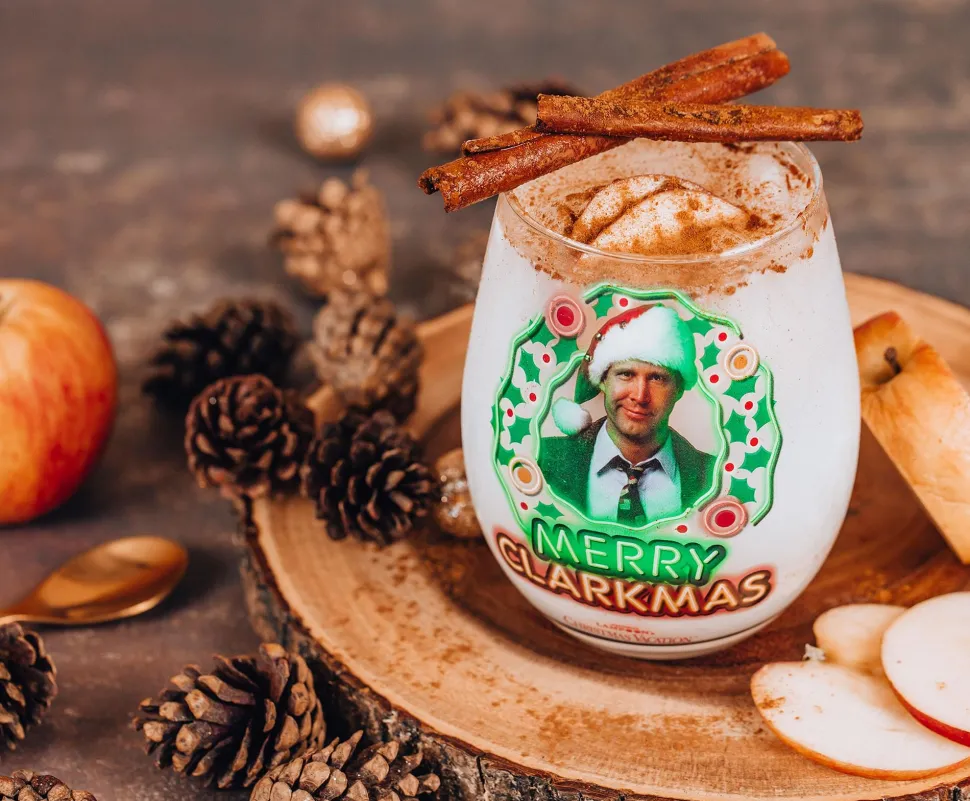 The high-quality graphic depicts Clark in his signature Santa Claus hat, along with the text “Merry Clarkmas.” Complete with the National Lampoon’s Christmas Vacation logo at the bottom, this stemless wine glass is a must-have for any fan of the classic holiday movie.