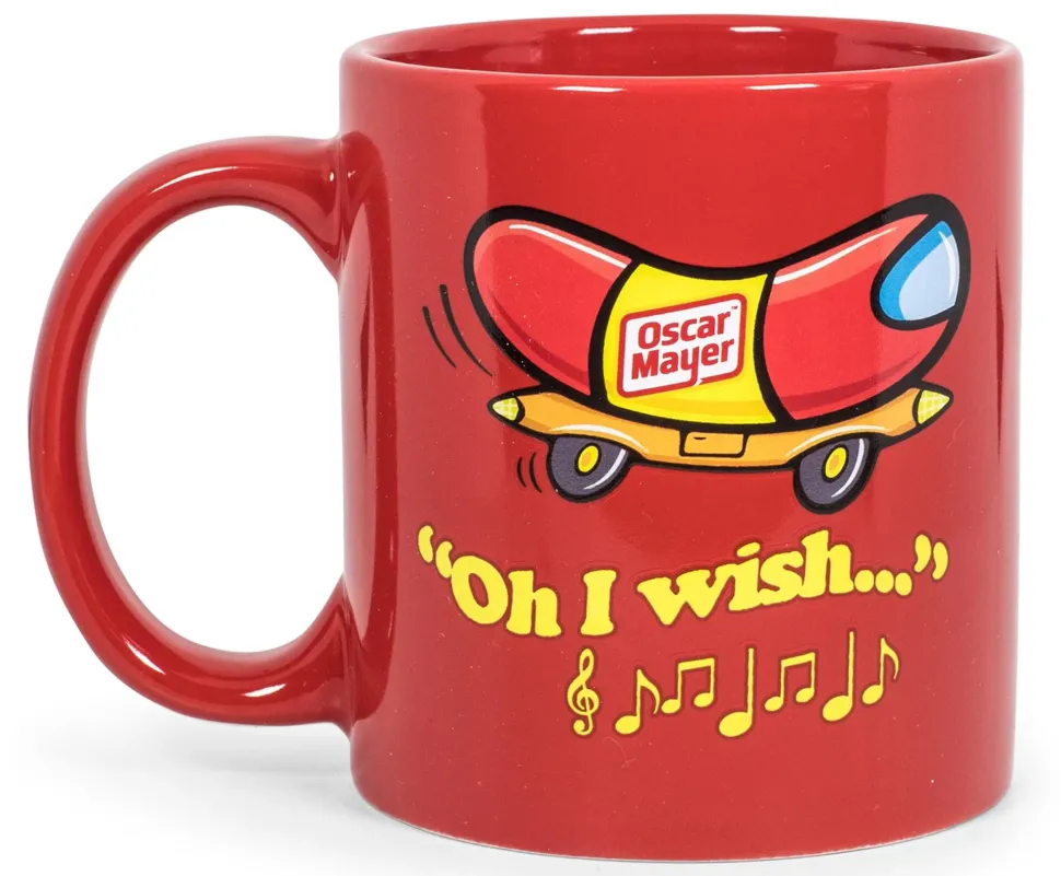 Inspired by the classic imagery of the popular hot dog brand, this coffee mug’s quality print graphics feature fun (and delicious) styling. This glossy red mug features a double-sided design, so you can show off your foodie fandom with every sip. One side of the cup features the famous Wienermobile, along with the start of the classic jingle “Oh I Wish…” for an extra touch of nostalgia. Additionally, the other side has the official Oscar Mayer logo.