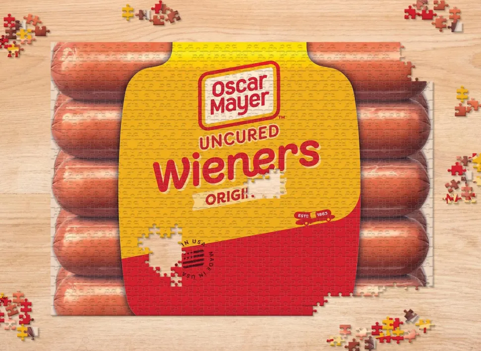 Snap into action assembling this stimulating puzzle featuring Oscar Mayer’s original uncured wieners. Each piece you place recreates the golden yellow and red packaging for the popular bunned cuisine. No detail has been overlooked in the mouth-watering design, from the classic company logo to the “Made in the USA” stamp.