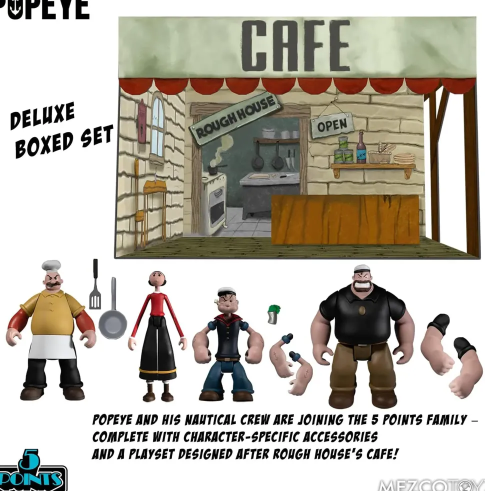 Ah ga ga ga! This titanic boxed set features Popeye, Olive Oyl, Bluto, Rough House, and a playset – talk about a whale of a time! Once assembled, Rough House’s Cafe features all the familiar details as seen in the nostalgic comic strips. THE 5 POINTS POPEYE: DELUXE BOXED SET INCLUDES: Popeye – Known for his constant muttering, squinting, and superhuman strength after gulping down a can of spinach, Popeye will do whatever it takes to rescue his beloved Olive Oyl from the wicked hands of Bluto. Popeye comes with a spinach can that he can hold and two pairs of interchangeable arms. Olive Oyl – the poster girl for “damsel in distressâ€, Olive Oyl is Popeye’s eternal sweetheart. The two have stuck together through thick and thin. Bluto – the brutish arch-rival of Popeye, Bluto is always trying to get rid of Popeye or strike it rich. Bluto has a devious attraction towards Olive Oyl and usually attempts to make her his conquest. Bluto comes with two pairs of interchangeable arms. Rough House – a hard working chef and owner of Rough House’s Café, offering hamburgers and advice to those in need. Rough House comes with a spatula and a frying pan that he can hold. Rough House’s Café – owned and operated by Rough House himself, this greasy spoon is the local hotspot for Popeye and his pals. ACCESSORIES: Two (2) pairs of interchangeable arms for Popeye Two (2) pairs of interchangeable arms for Bluto One (1) can of spinach One (1) spatula One (1) frying pan Four (4) display bases 5 Points are Mezco’s upgrade to the articulated action figures of yesteryear. These highly detailed, poseable action figures feature some of pop culture’s most familiar faces, both old and new.
