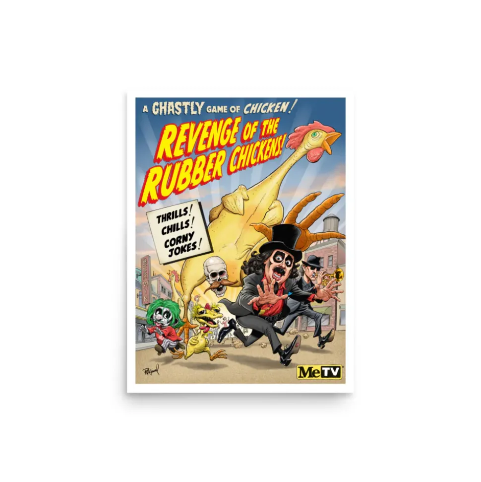 Svengoolie® finds himself in a 50s era monster movie poster in this original design that includes his friends (from left) Durwood, Kerwyn, Tombstone, and Doug Graves! “Revenge of the Rubber Chickens” is our second releasein the ! This collectible design was created by award-winning cartoonist and humorous illustrator.