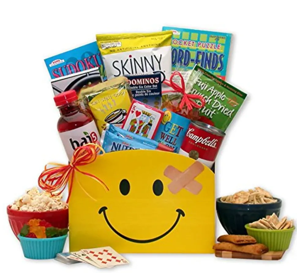 Smiles Across the Miles Get Well Gift Box includes: Smiley face gift box, Sudoku puzzle book, Word search puzzle book, 2 oz White cheddar popcorn, Get Well Soon Coffee, Bai Pomegranate Juice, 2 Nutri-Grain bars, playing cards, Get Well soon gummy bears, Dominos, Fuji Apple Crunch dried fruit snack, Campbell’s Chicken Noodle soup, Cracked pepper stone wheat crackers 2 oz. Completed gift measures 11″ long by 8″ wide by 15″ tall, is wrapped in cellophane and topped with a hand tied bow. Completed gift weighs 4 pounds.