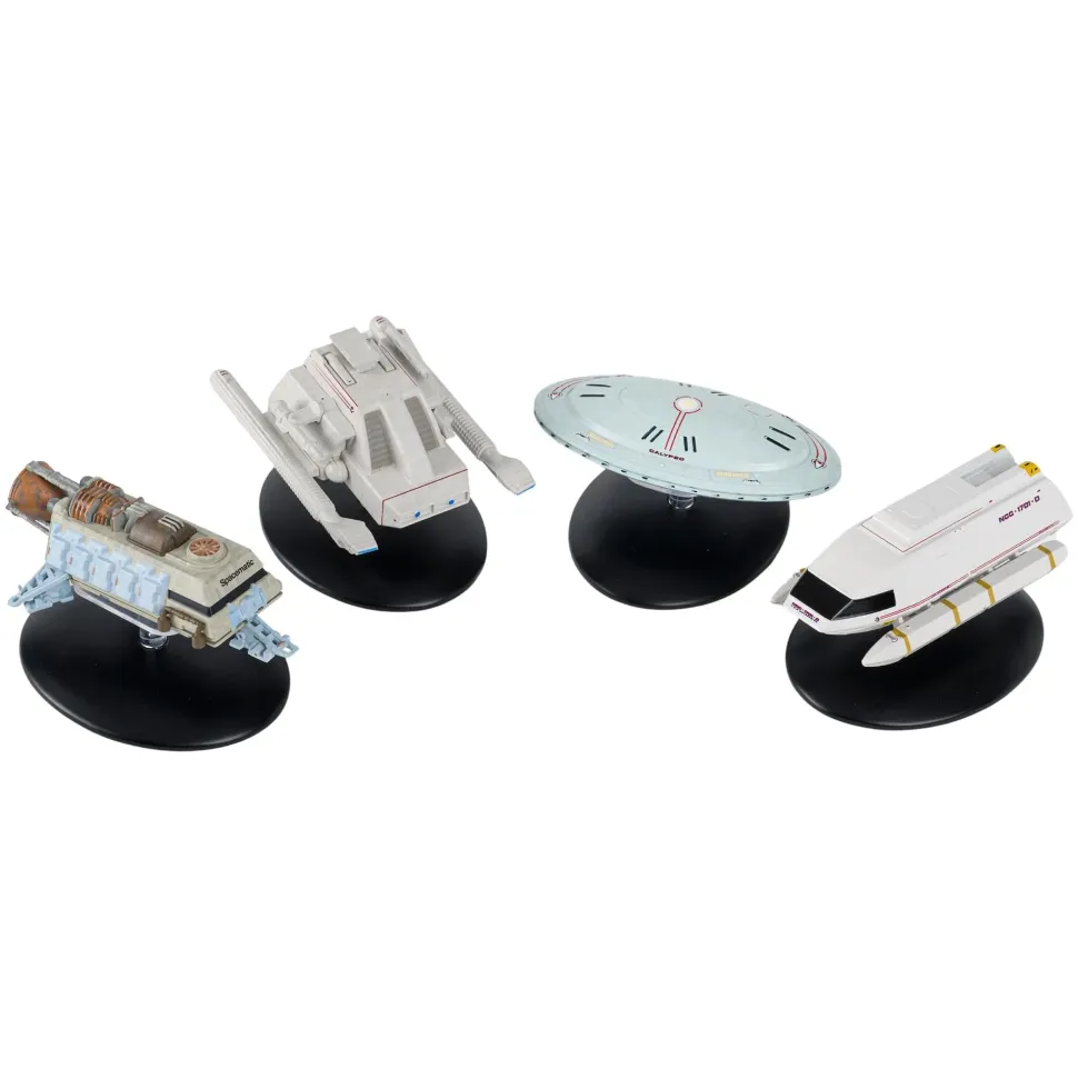 This incredible new Shuttlecraft Set #7 collects four brand new shuttles from across the STAR TREK universe brought to by STAR TREK Official Starships Collection. This collection includes: Issue 25 – Captain’s Yacht “Calypso”, which is docked beneath its saucer section “Spacematicâ€. Issue 26 – Docking Shuttle A Federation auxiliary craft in service during the 24th century. Issue 27 – Cyrano Jones’ “Spacematic” – The scout vessel of rogue trader Cyrano Jones. Issue 28 – Cargo Shuttle Type 9A, which made its debut in the Star Trek: The Next Generation Technical Manual Docking Shuttle. These amazingly detailed Star Trek shuttles are cast in metallic resin, includes a display stand and specially-commissioned Okudagram schematic, created by Mike Okuda precisely as he would have done if it had been used on the show. These new Okudagrams are printed on a plastic sheet with a stand for easy display. This set is ready to set you on a course to explore strange new things!