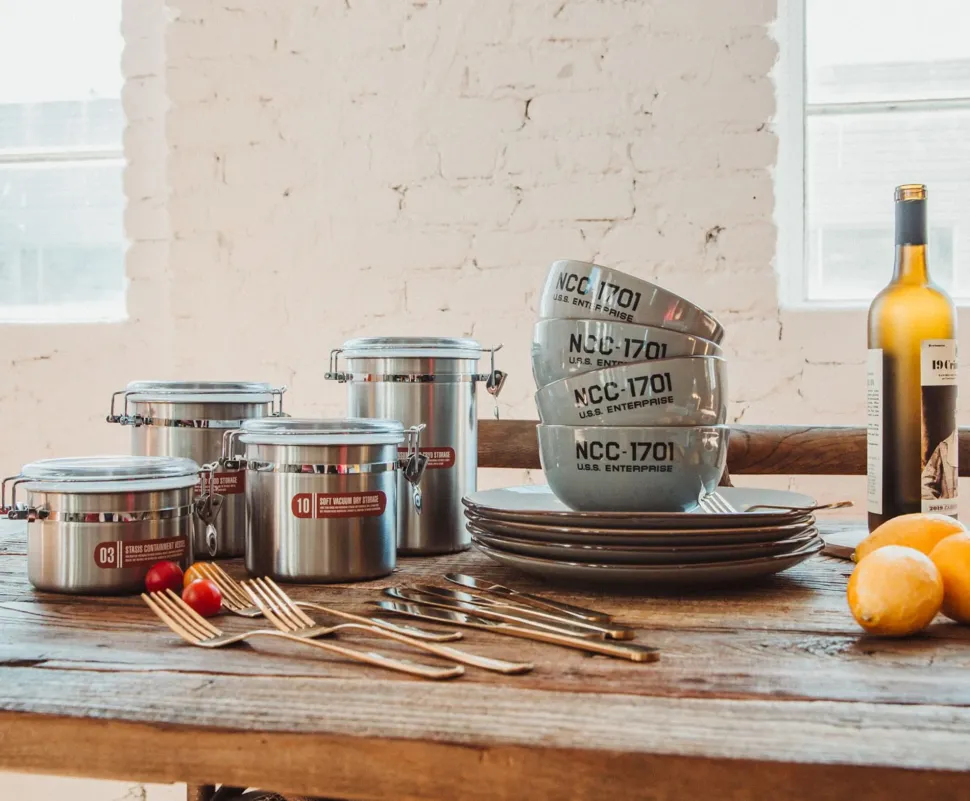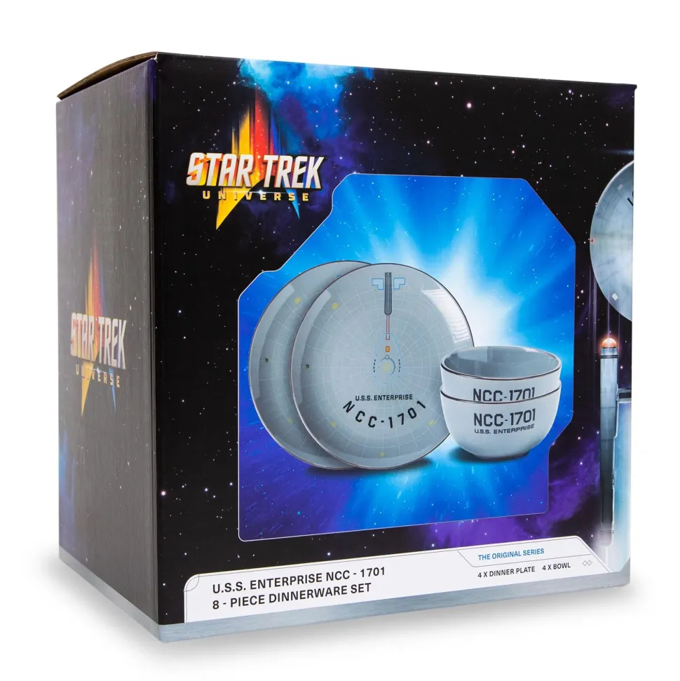 Behold a plate and bowl set emblazoned with Constitution-Class finery. Plates with the primary hull of the USS Enterprise printed on them and bowls labeled with NCC-1701, the mighty starship’s Naval-Construction-Code registry.