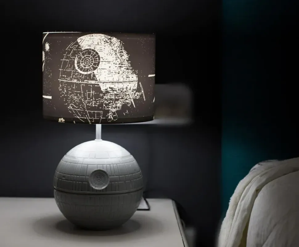 This Star Wars Death Star Touch Lamp is most impressive. Specially crafted with Empire-approved materials, this desk lamp features a 3D sculpted base of the iconic battle station and a black lamp shade. The printed shade features fan-favorite ships from the Star Wars galaxy, including the Death Star, TIE Fighters, X-Wings, and the Millennium Falcon.