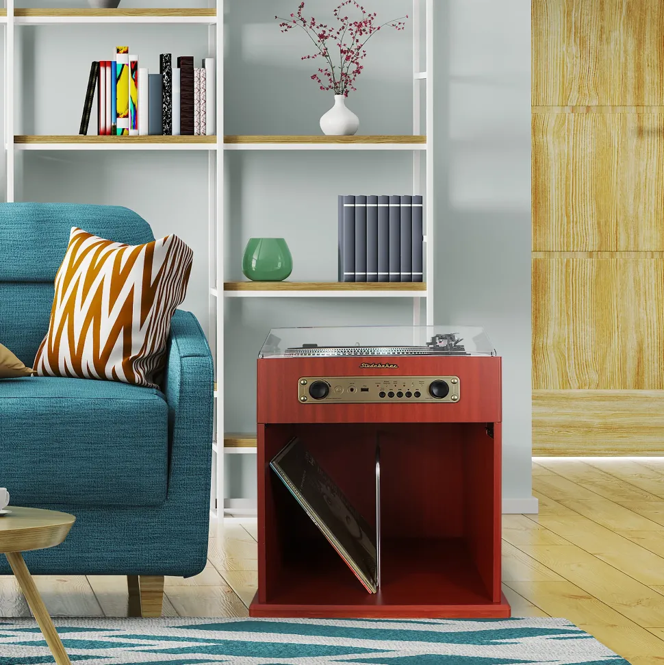 Play and store your vinyl music collection with this Studebaker 3-Speed Stereo Turntable with Bluetooth Receiver and Record Storage Compartment. This turntable with full size platter and auto-return features built-in speakers so it works as a stand-alone music system. You can also wirelessly stream your music from any Bluetooth enabled device. This belt-driven unit is versatile enough to play all three common speeds (33-1/3, 45, and 78 rpm) so you’re not restricted to any one part of your record collection. The spacious record storage compartment enables you to keep your favorite albums safe and close at hand. In addition, the classic, nostalgic cabinet features an auxiliary input jack that allows you to connect to your iPod®, MP3 player, or any other digital audio players. There is also a USB port for music playback from a flash drive. The unit operates on 120V AC and includes a dust cover for protecting the turntable when not in use.