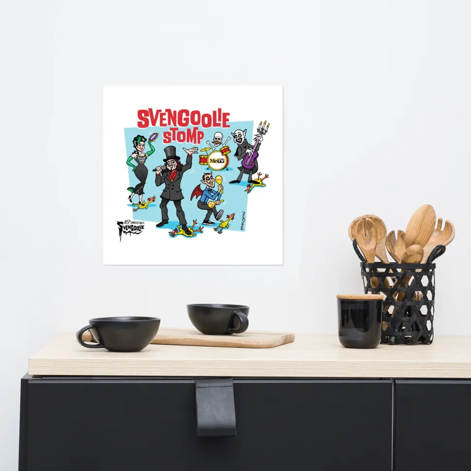 We’re celebrating Svengoolie’s single, , with this new Svengoolie® 45th Anniversary design by artist Jeff Carlson. The music video, starring our favorite horror host with Freddy “Boom Boom” Cannon, shows cast and celebrities stomping on their rubber chickens. This anniversary design imagines the Sven Squad™ grabbing their instruments and joining in the stomp as MeTV’s rock band honoring this moment of Svengoolie history.