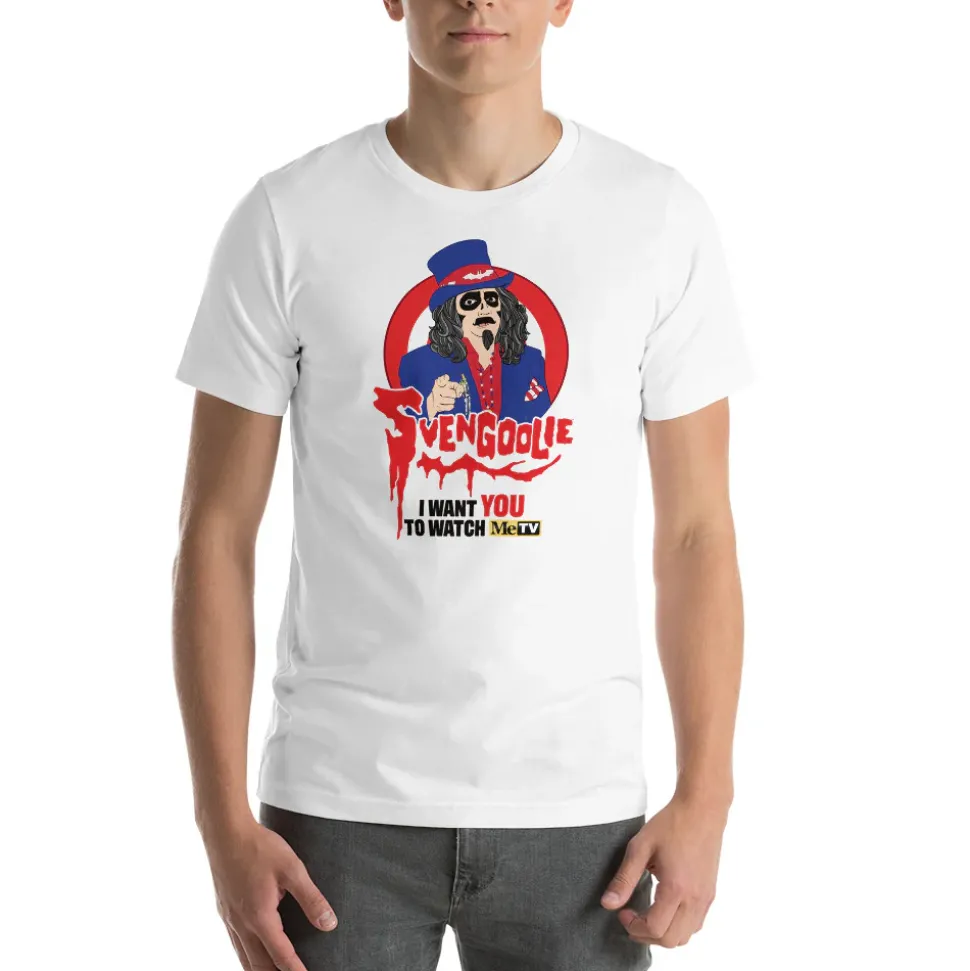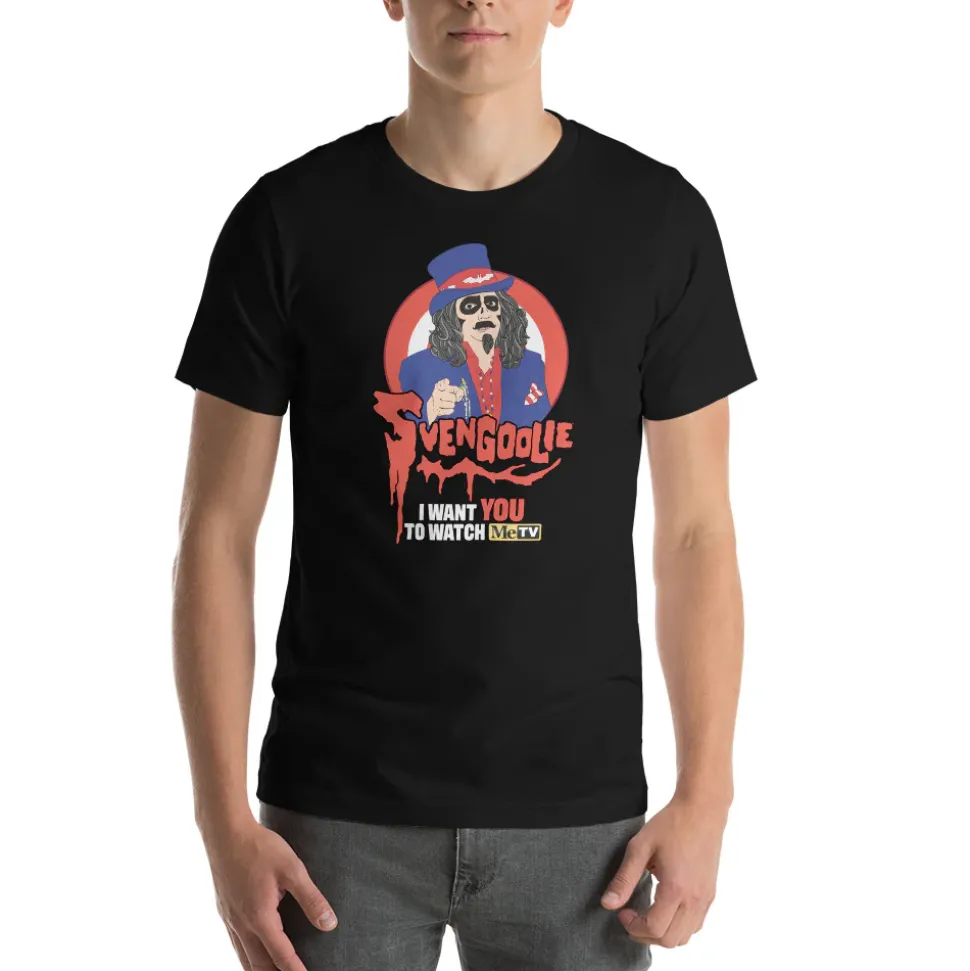 Svengoolie is recruiting you to watch MeTV, while wearing his Uncle Sven July 4th U.S.A. finest! Wear this design on a t-shirt, tank top, or crop top to your summer BBQ, trip to the beach, or late night bonfire after watching Svengoolie.