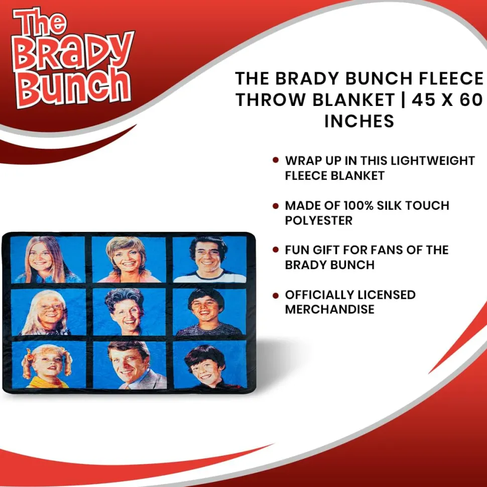 Show off your love of The Brady Bunch with this warm and cozy fleece throw blanket. The design of the blanket features the classic opening credits of the TV show, depicting the iconic cast of characters in a grid pattern. This throw blanket makes a perfect addition to any room in your house, so you can snuggle up and give your space an extra cozy feel.