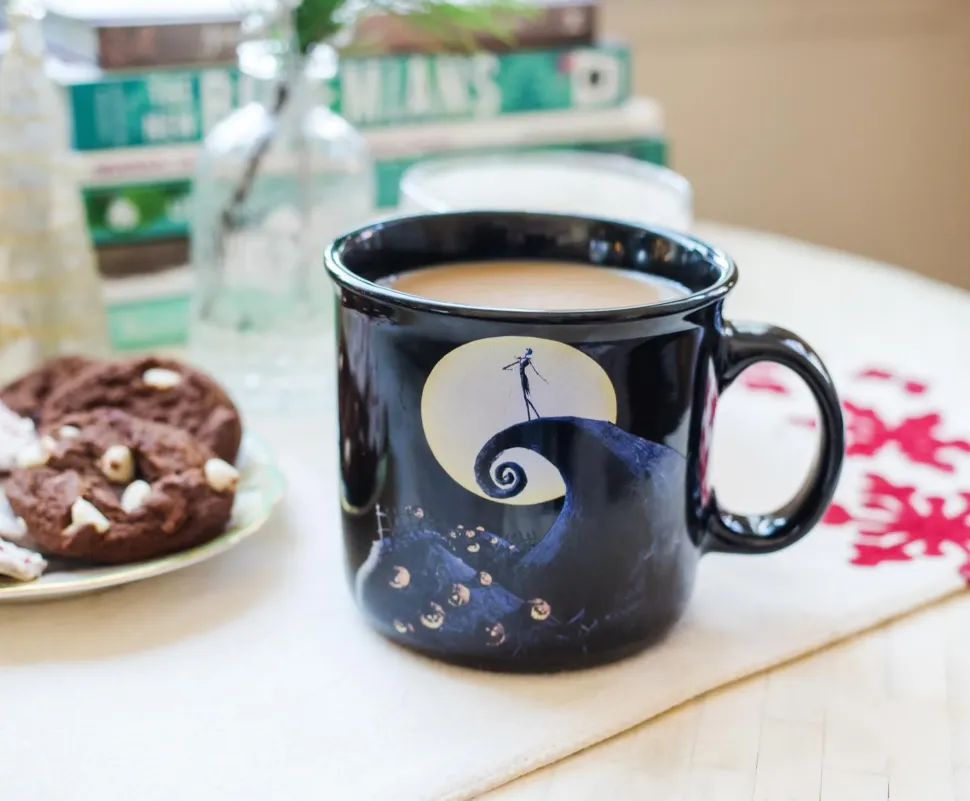 Fans of Tim Burton’s musical fantasy film The Nightmare Before Christmas will love this frightfully delightful camper-style coffee mug. Enjoy your favorite refreshing beverage in style with trendsetting drinkware, featuring a spooktacular design based on the classic stop-motion animated movie. Inspired by one of the most famous scenes from Disney’s The Nightmare Before Christmas, the pitch-black coffee mug captures the iconic image of Jack Skellington standing on Spiral Hill against a moon-lit sky.